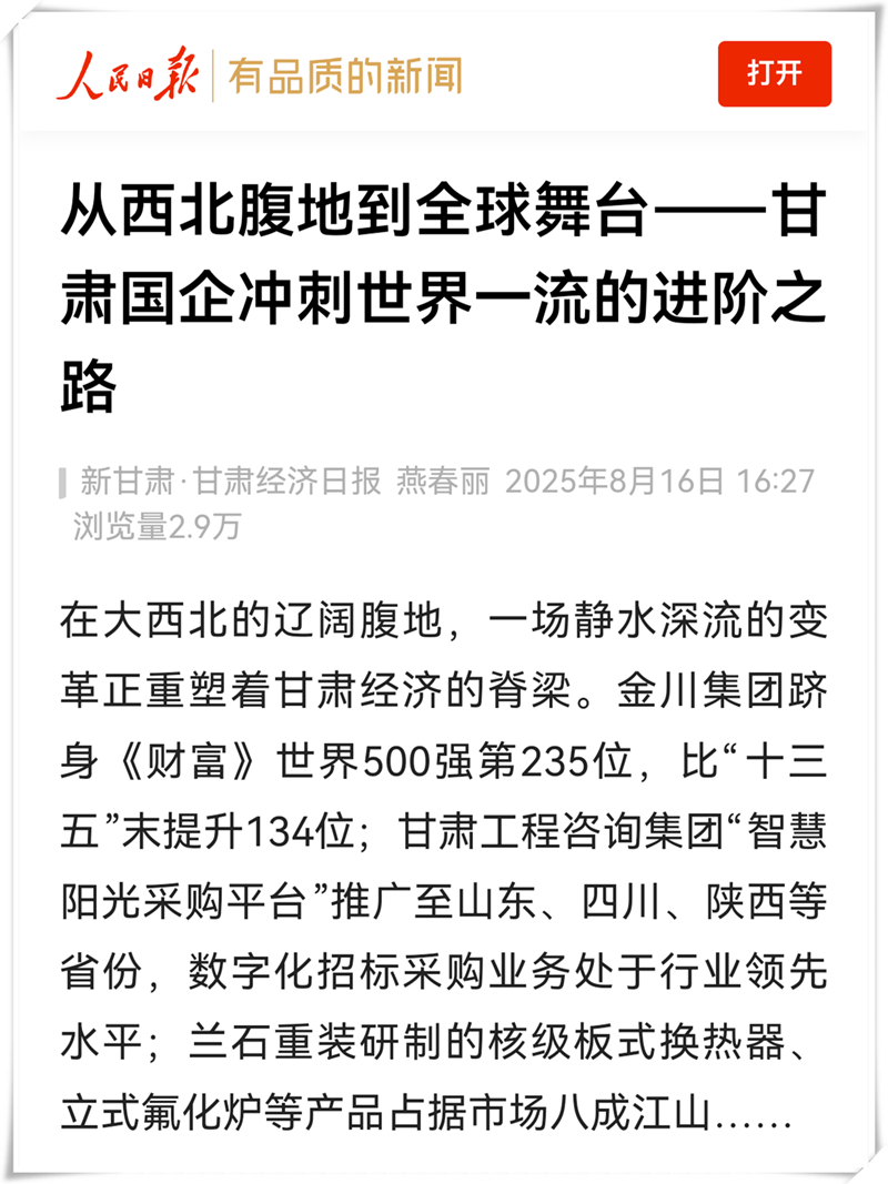 在大西北的遼闊腹地,一場(chǎng)靜水深流的變革正重塑著甘肅經(jīng)濟(jì)的脊梁。金川集團(tuán)躋身《財(cái)富》世界500強(qiáng)第235位,比“十三五”末提升134位;甘肅工程咨詢(xún)集團(tuán)“智慧陽(yáng)光采購(gòu)平臺(tái)”推廣至山東、四川、陜西等省份,數(shù)字化招標(biāo)采購(gòu)業(yè)務(wù)處于行業(yè)領(lǐng)先水平;蘭石重裝研制的核級(jí)板式換熱器、立式氟化爐等產(chǎn)品占據(jù)市場(chǎng)八成江山……