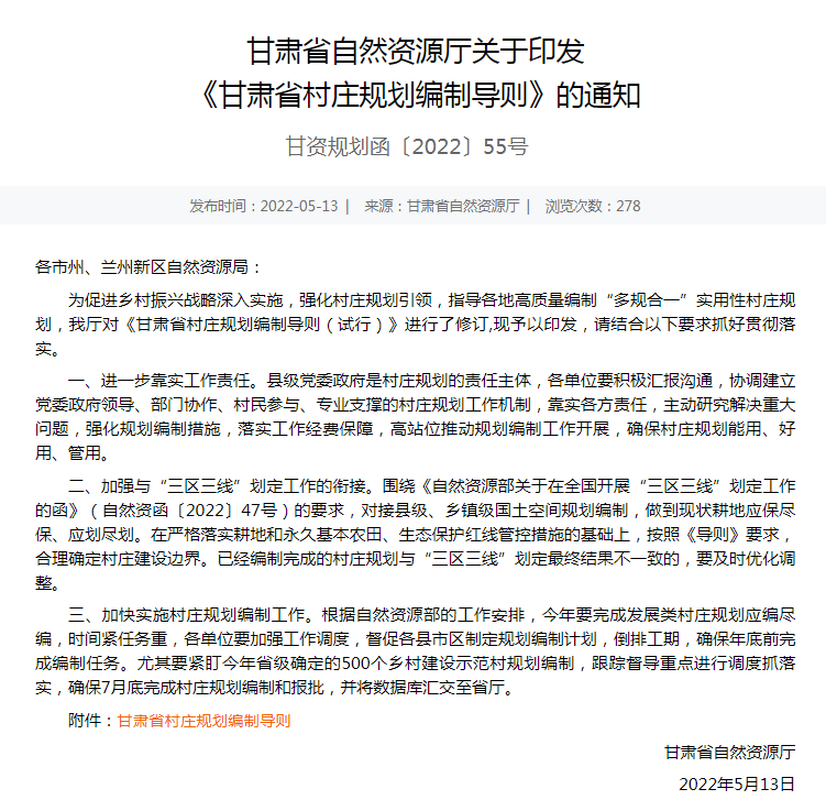 為深入貫徹習(xí)近平總書記視察甘肅重要講話和指示精神,落實(shí)省委、省政府關(guān)于村莊規(guī)劃工作部署,促推鄉(xiāng)村振興戰(zhàn)略深入實(shí)施,指導(dǎo)各地高質(zhì)量編制“多規(guī)合一”實(shí)用性村莊規(guī)劃。近日,由甘肅省自然資源廳牽頭組織,甘肅省城鄉(xiāng)規(guī)劃設(shè)計研究院有限公司參與起草的《甘肅省村莊規(guī)劃編制導(dǎo)則》正式印發(fā)實(shí)施。